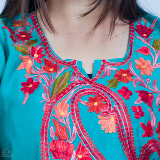 Pacific Blue Ruby Cotton Co-ord Set with Aari Embroidery