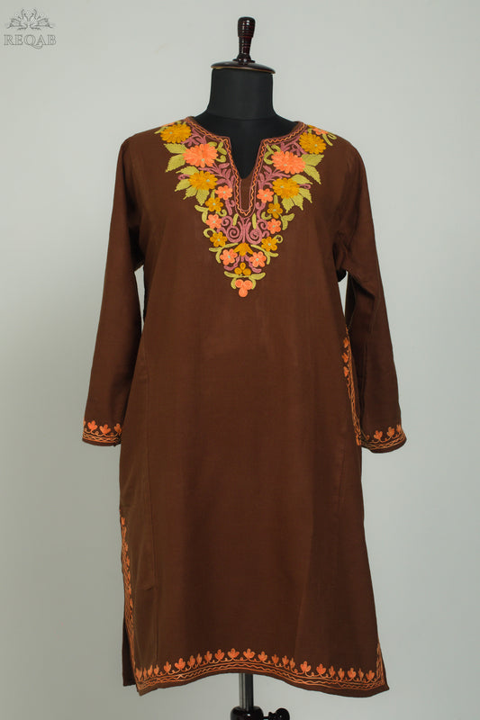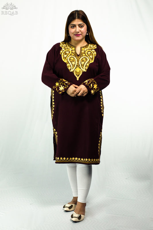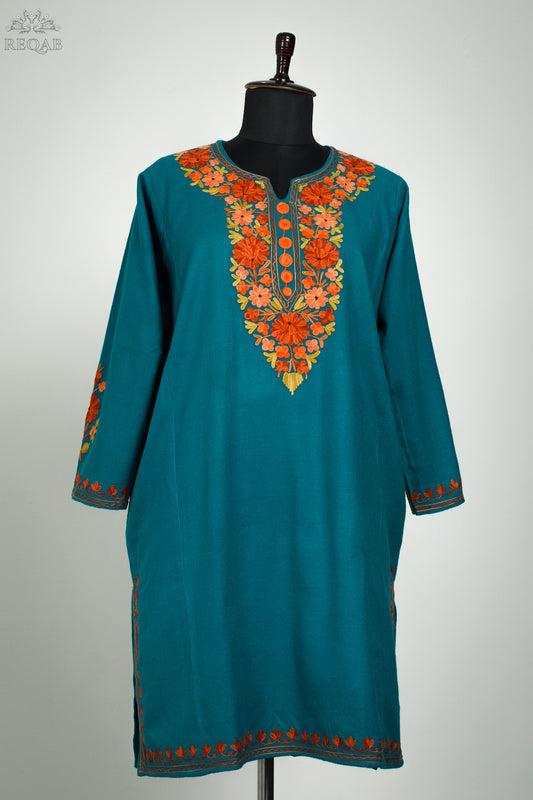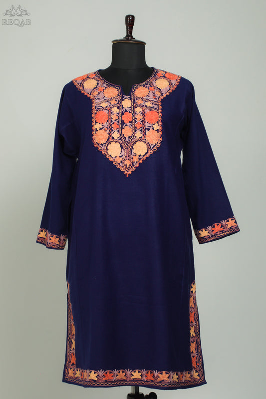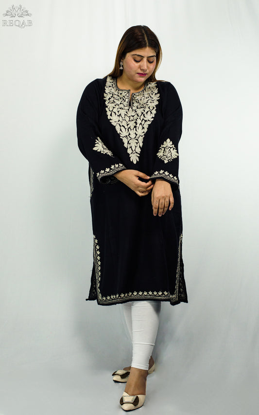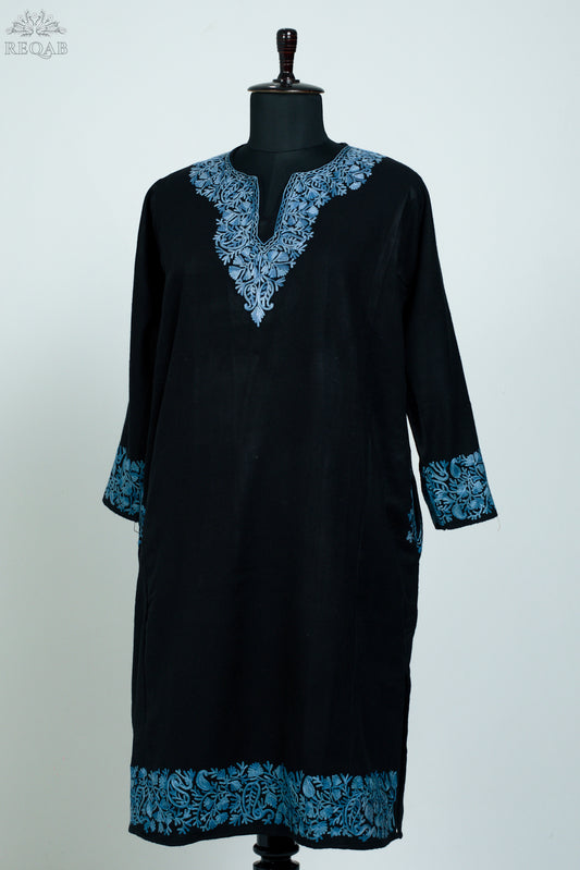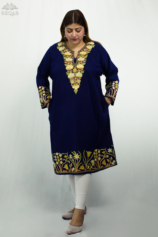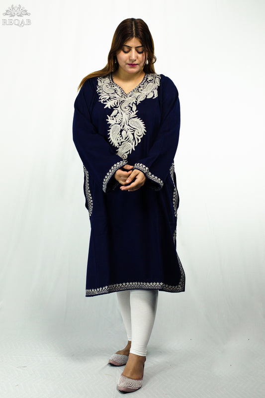 Midnight Express Blue Pheran with Aari Embroidery on Zari Border