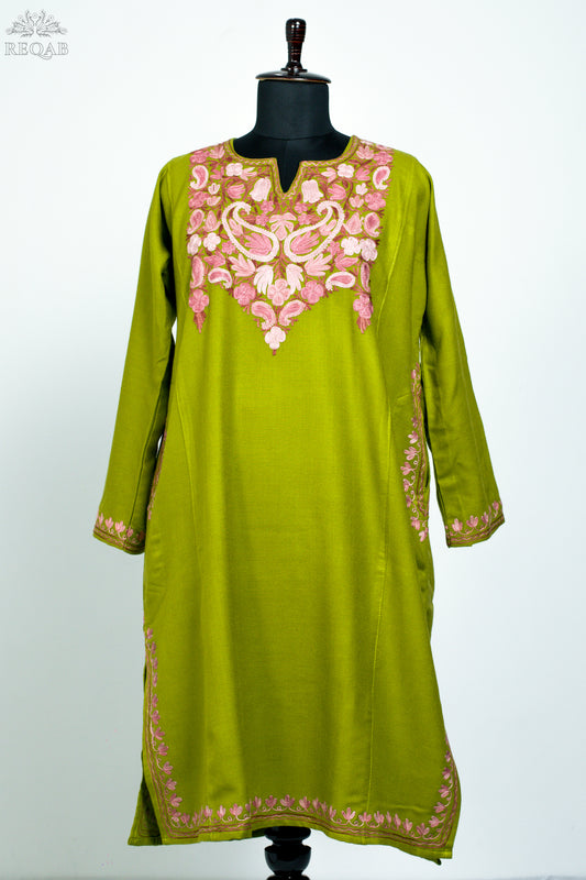 Citron Green Pheran with Almond Shaped Aari Embroidery
