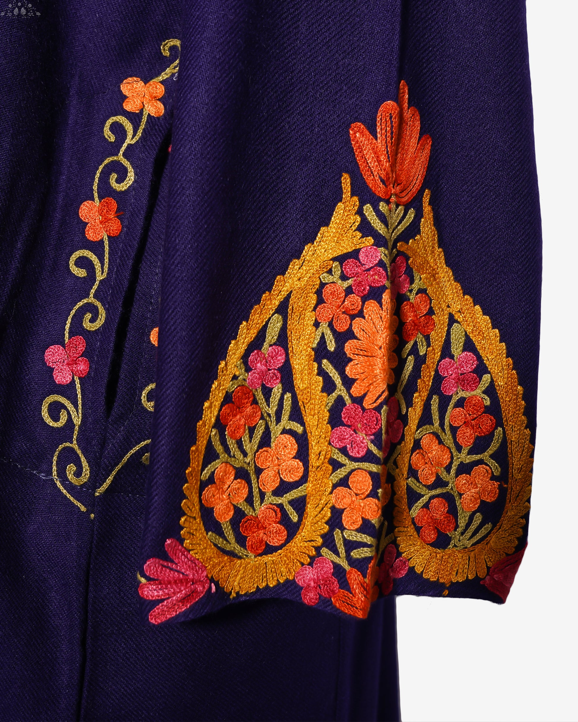 The combination of the rich cashmilon fabric's drape and the brilliant multicolored embroidery creates a perfect harmony between traditional Kashmiri craftsmanship and contemporary style, making this pheran an ideal choice for both festive occasions and sophisticated everyday wear.