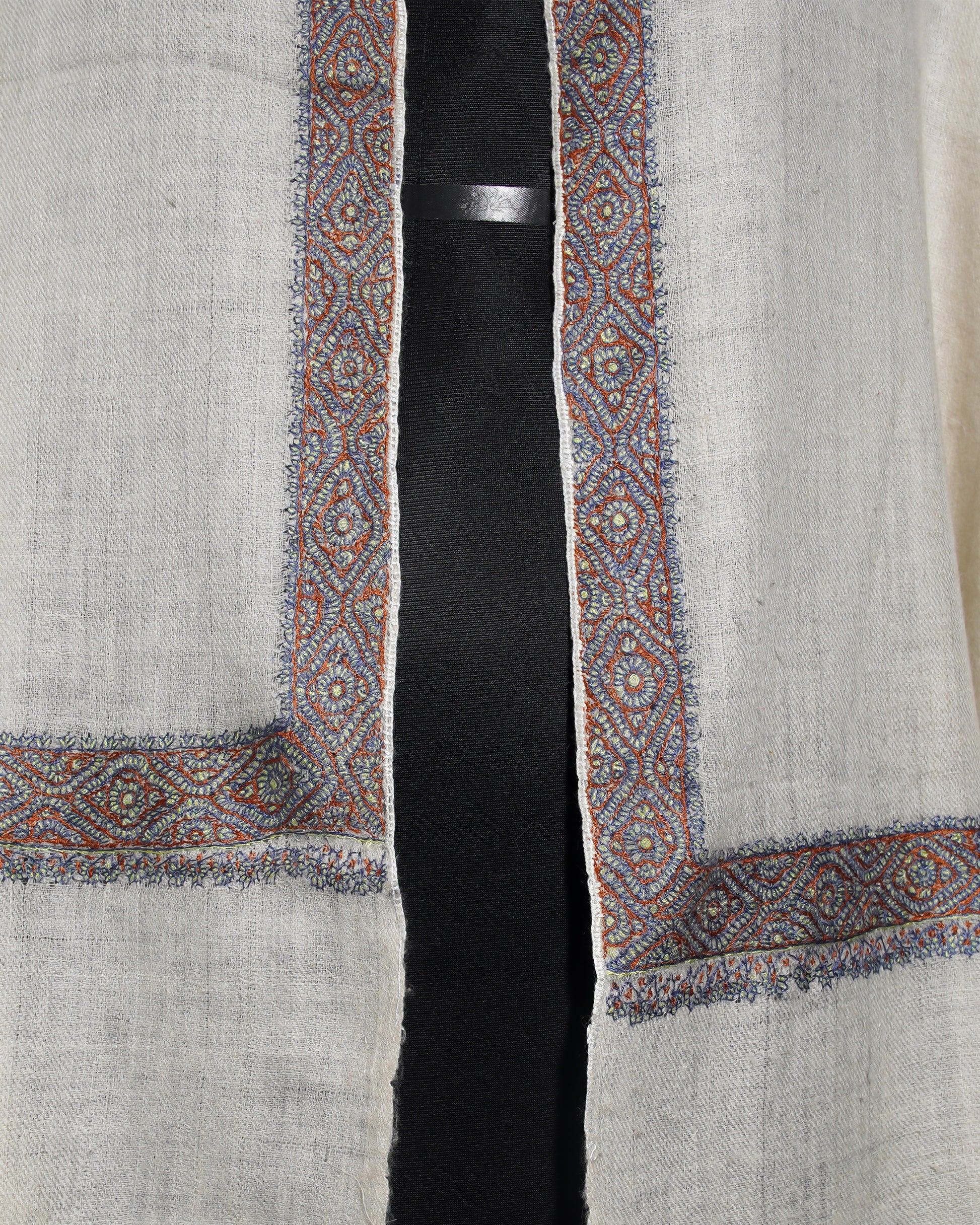 Delicate Artisanal Detail: A small, exquisite band of hand Sozni embroidery traces the entire perimeter of this sumptuous stole, executed with the meticulous precision that defines Kashmir's most revered embroidery tradition. Rendered in refined shades of sophisticated grey, warm brown, and the merest whisper of green—so subtle it reveals itself only upon closer inspection—the embroidery creates a delicate frame that enhances rather than overwhelms.