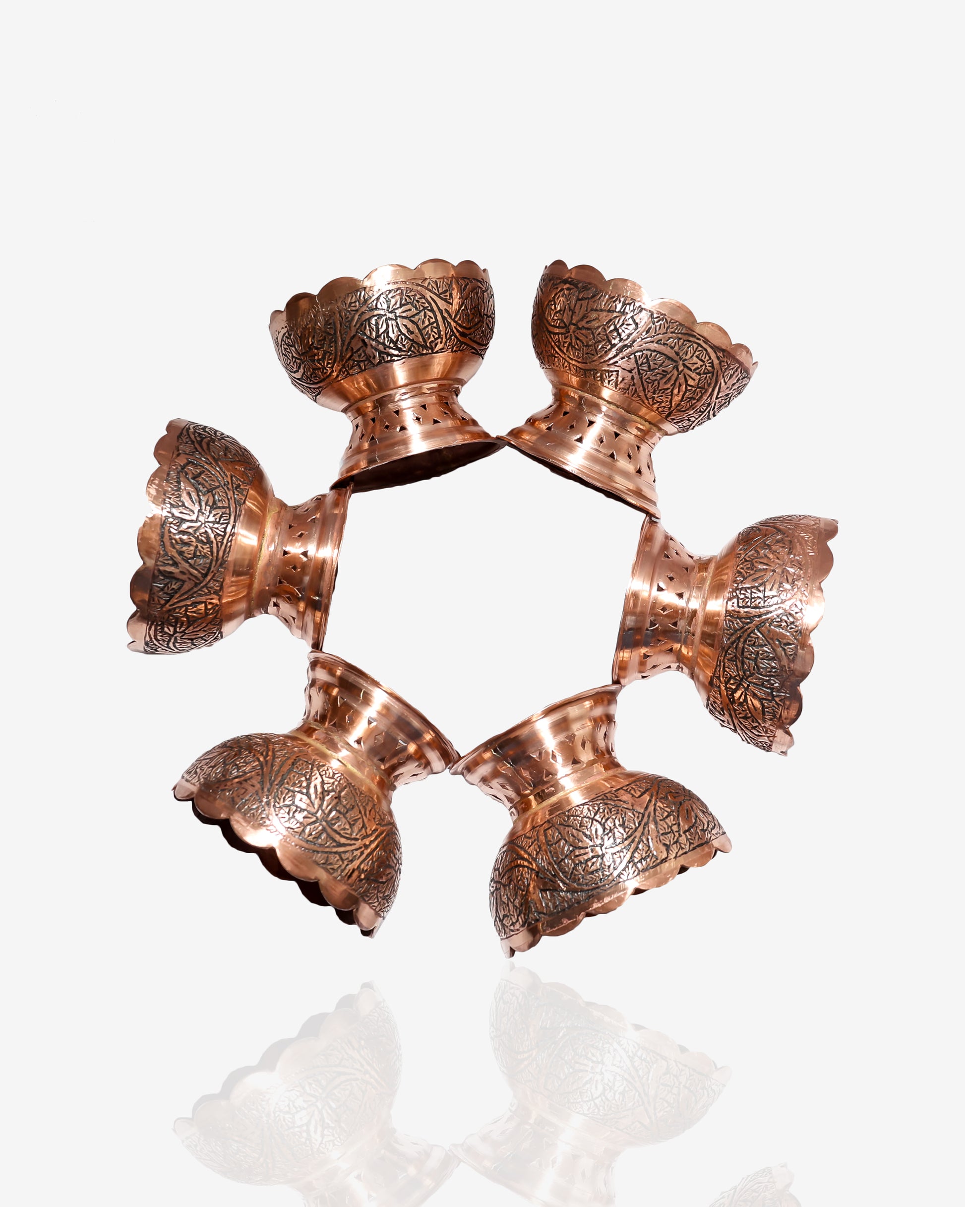 This charming set of six copper ice cream bowls brings the elegance of Kashmir's traditional metalwork to your dessert service. Each bowl showcases exquisite hand-engraved chinar leaf patterns, meticulously carved by skilled Kashmiri artisans using the time-honored naqashi technique that has defined the region's copperware for centuries.