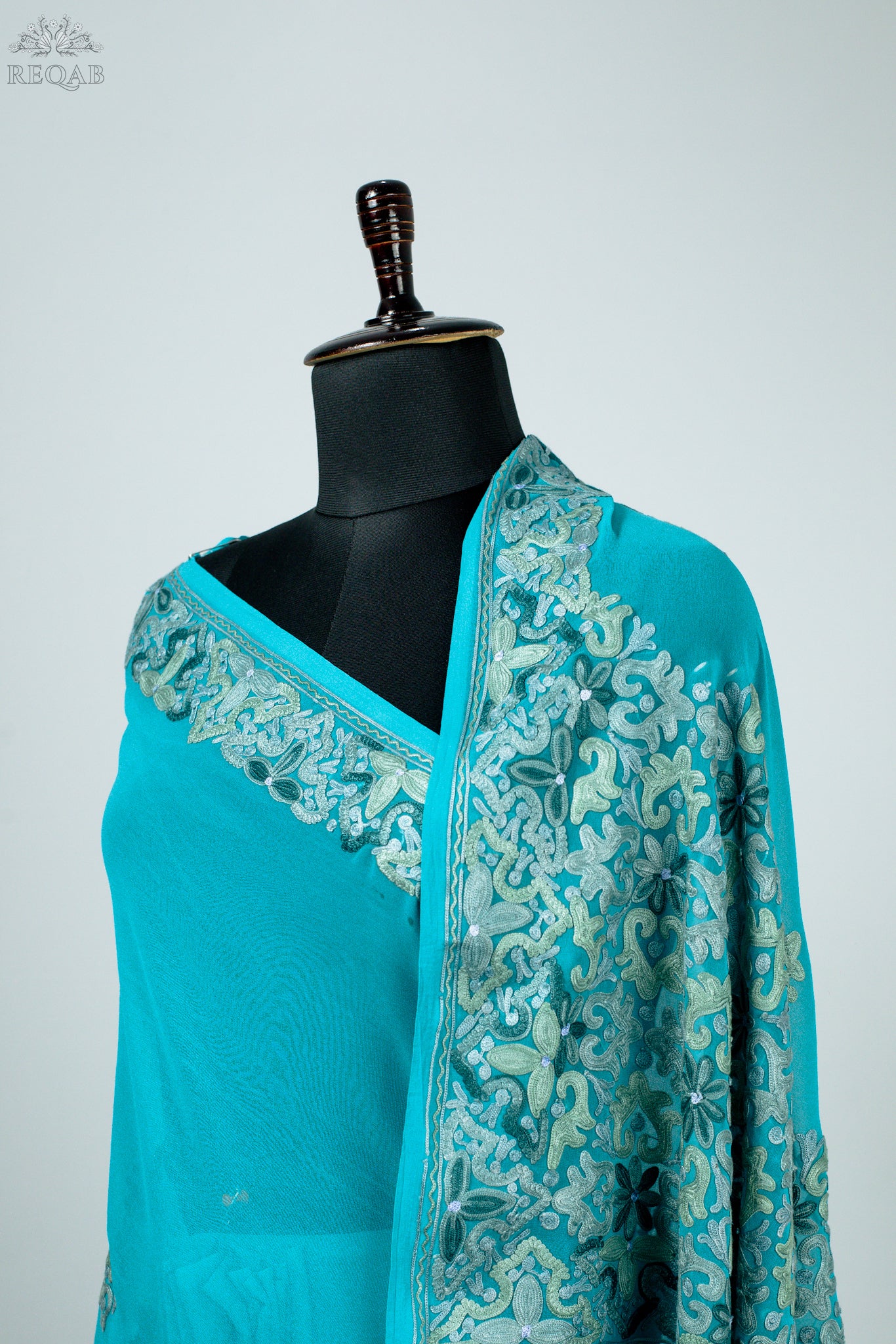 Light Sea Semi-Georgette Saree with Aari Embroidery