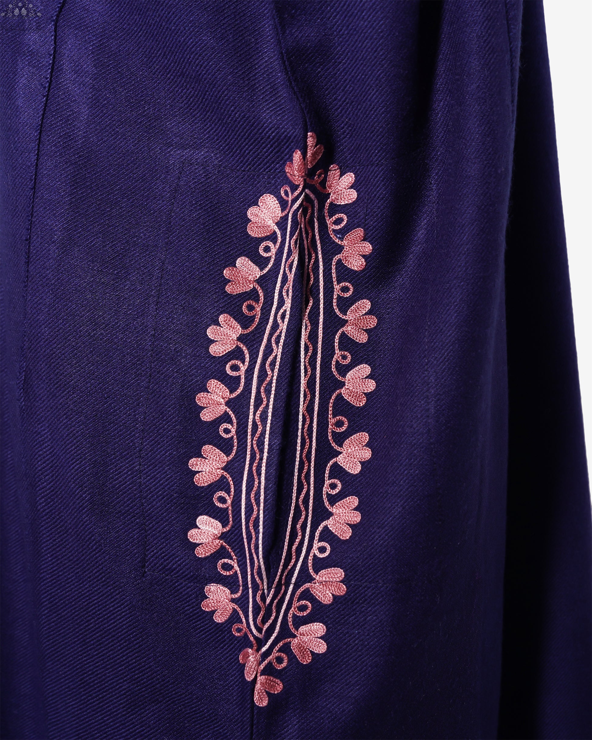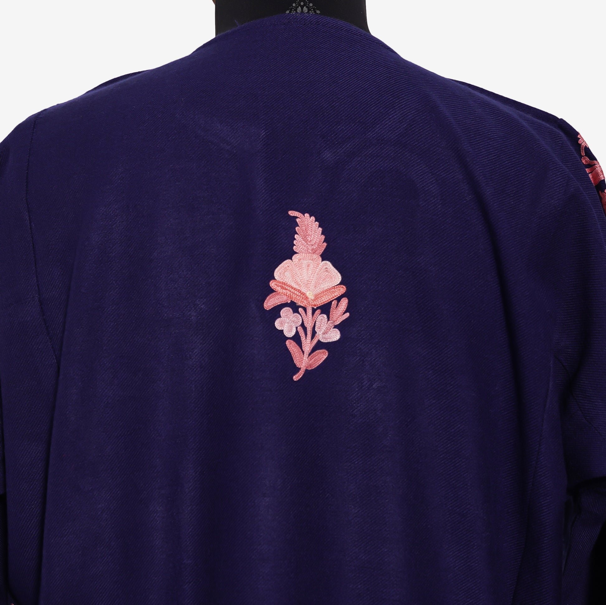 Distinguished by large embroidered patches adorning the upper sleeves, this pheran transforms traditional design elements into captivating artistic statements. These prominent features showcase the intricate Aari needlework at its finest, with pink florals cascading in elaborate detail against the misty backdrop.