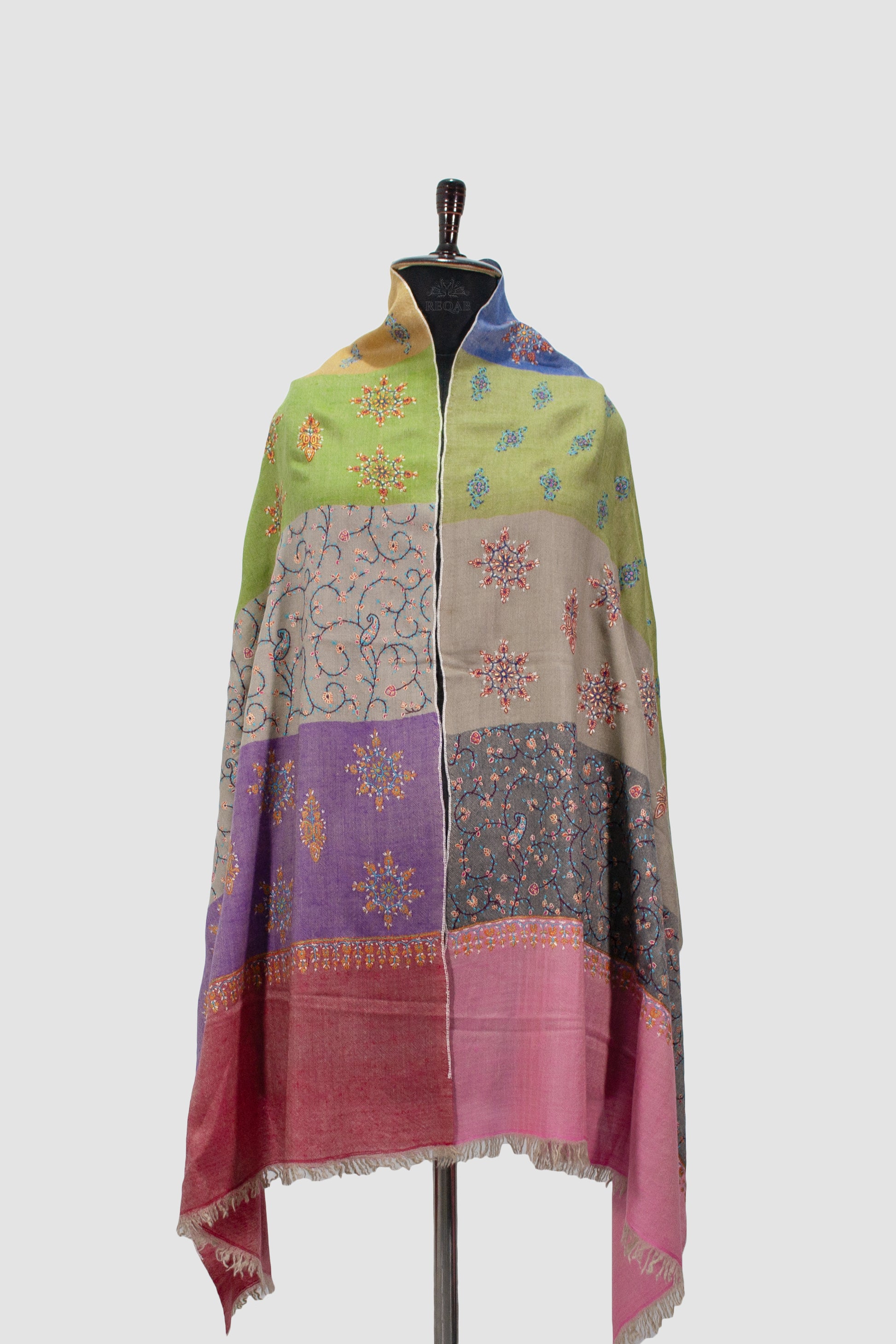 This Olive Green & Putty Stripes Pashmina Stole is the epitome of royal elegance, designed to make a statement of sophistication and exclusivity. Crafted from the finest pashmina, this stole embodies the exotic charm and warmth that only a genuine pashmina can offer. Its body is adorned with vertical bands in harmonious olive and putty tones, each band exquisitely decorated with intricate, modern hand Sozni embroidery. The embroidery, done in a palette of multiple hues, features timeless floral motifs that celebrate the artistry and cultural heritage of Kashmir.