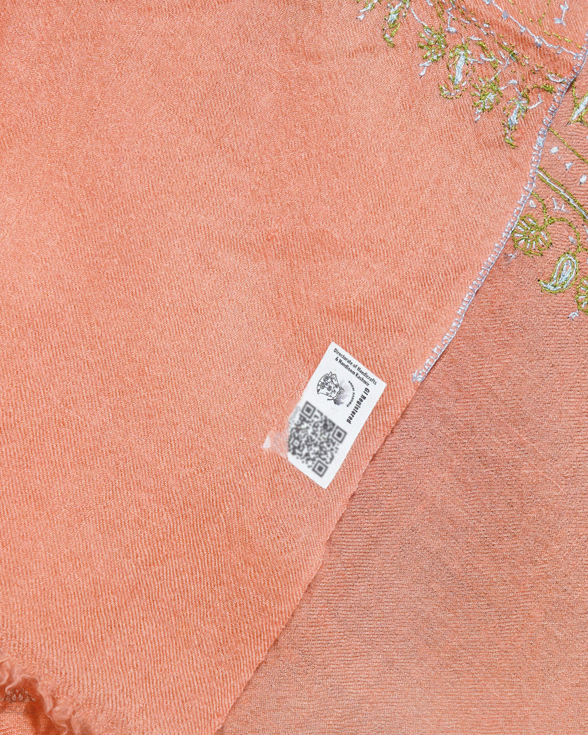 Embrace the authenticated luxury of the Himalayas with this exquisite Peach Blossom GI Pashmina Stole—a certified masterpiece bearing the prestigious Geographical Indication (GI) tag, your absolute assurance of genuine Kashmiri heritage and origin. A GI product is far more than a mark of quality; it is a legally protected certification that guarantees authenticity, verifying that this pashmina has been sourced from the high-altitude regions of Kashmir and handcrafted by skilled artisans in their ancestral homeland. When you choose a GI-certified piece, you hold in your hands a protected cultural treasure, safeguarded against imitation and counterfeit.