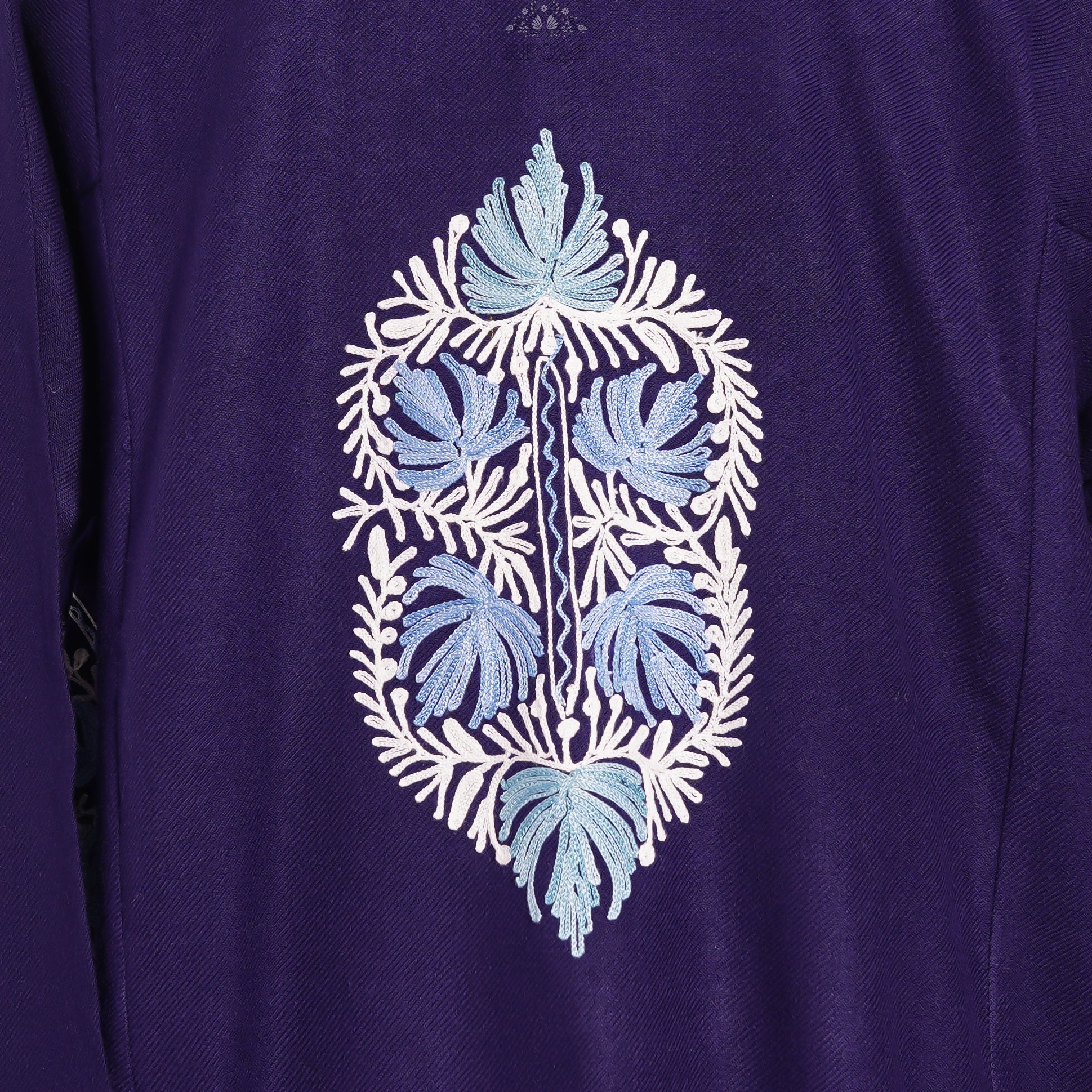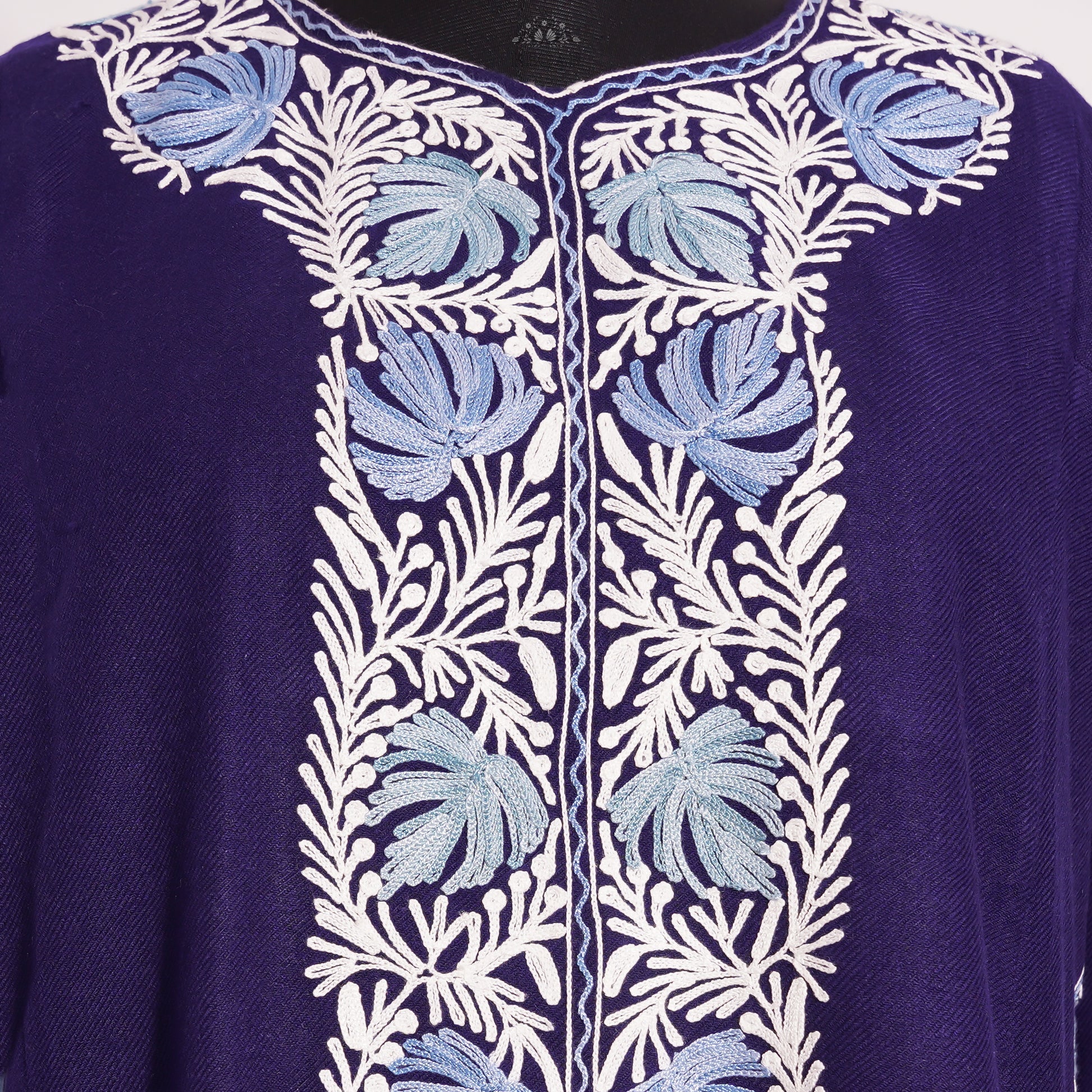 This pheran seamlessly blends traditional Kashmiri aesthetics with contemporary elegance, making it perfect for both festive occasions and sophisticated everyday wear. The harmonious color palette of Russian violet complemented by the white and blue embroidery creates a look