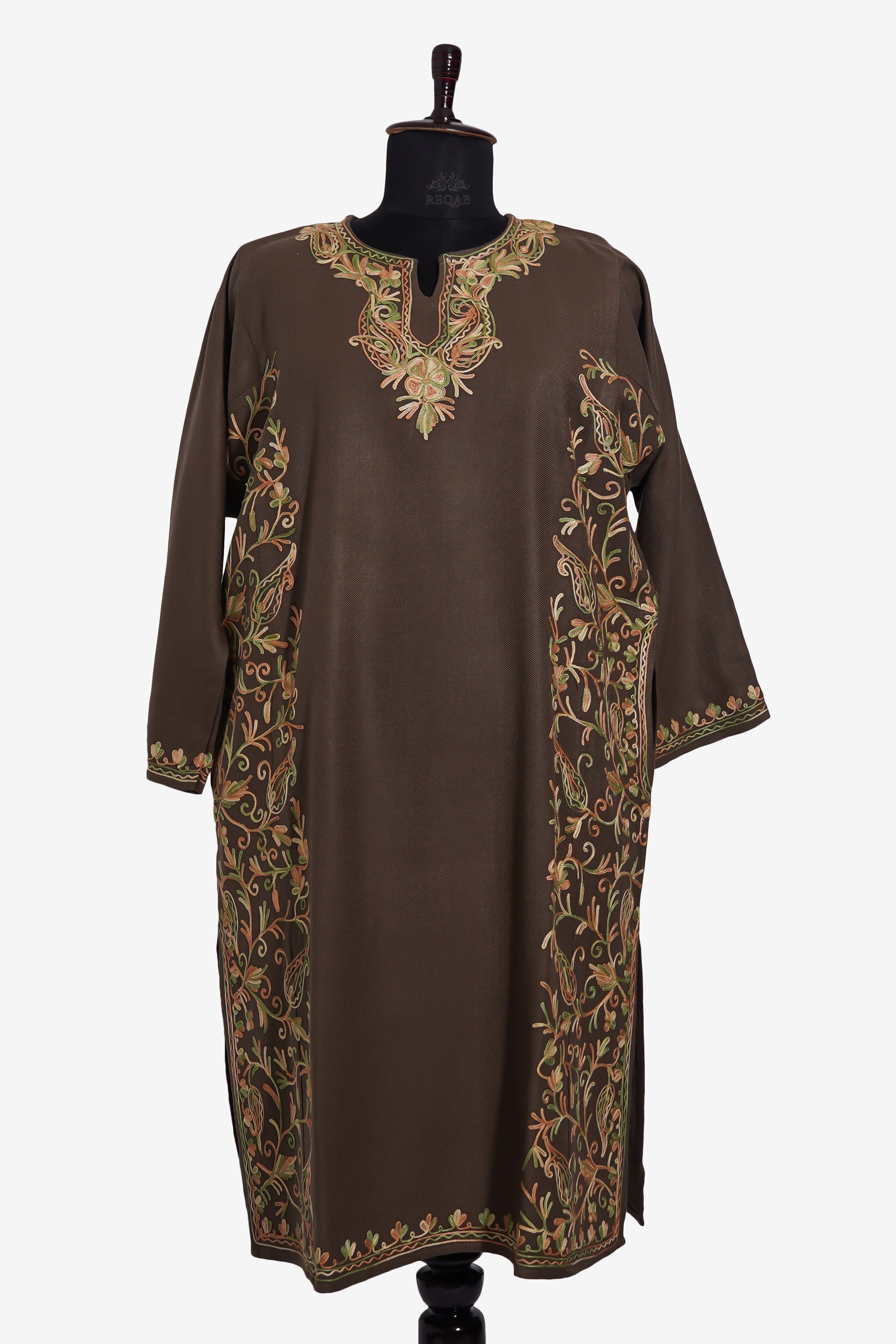 Rustic Oak Pheran - Artisan Cashmilon with Exquisite Aari Embroidery