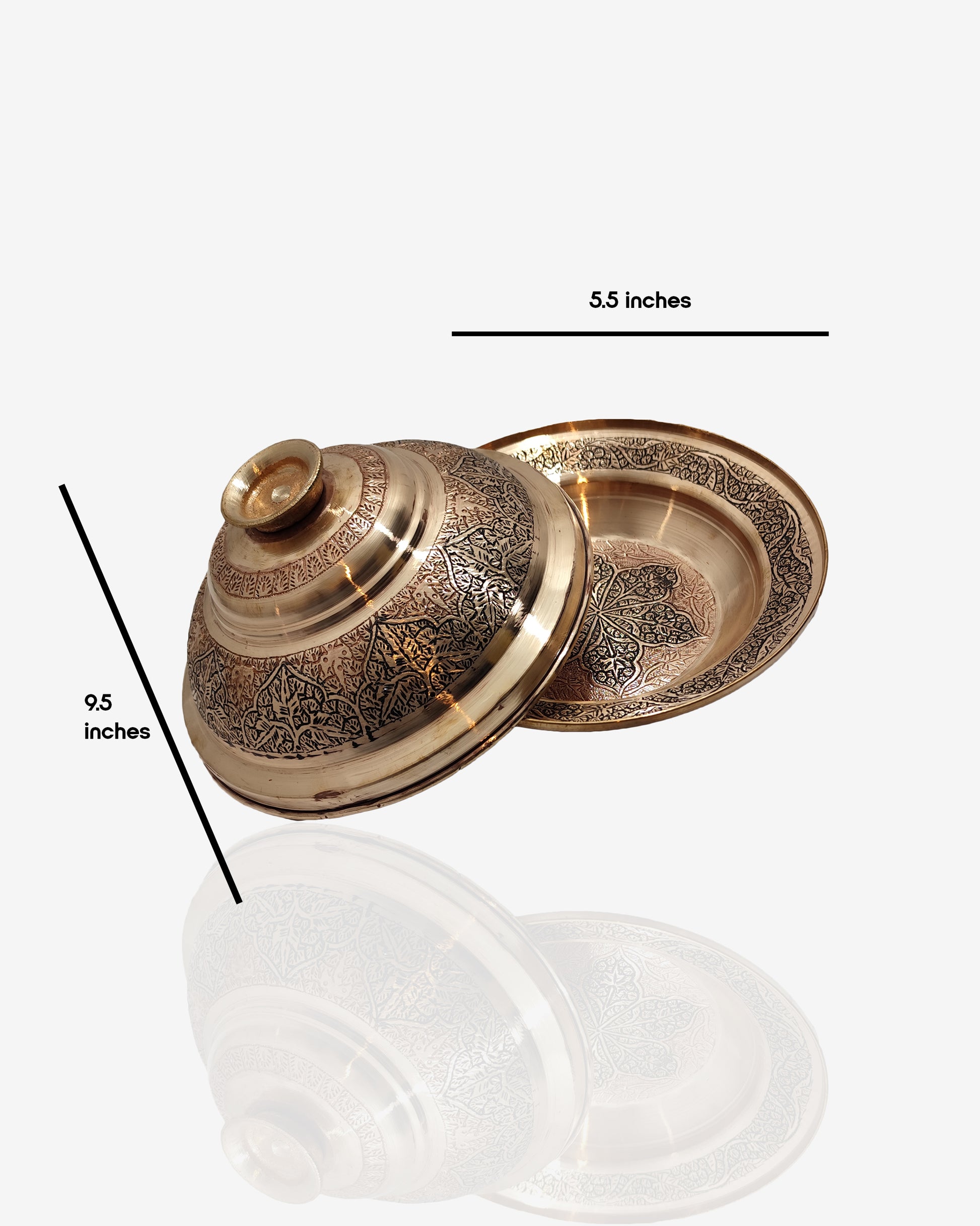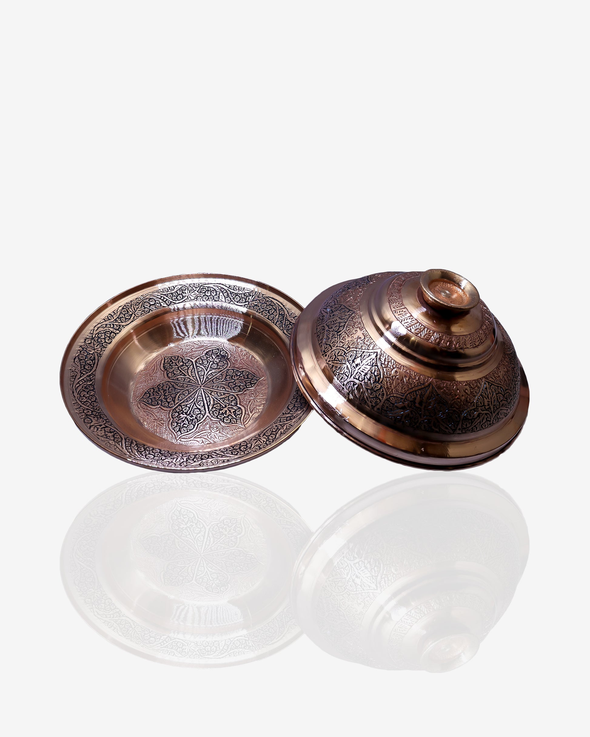 This magnificent sarposh (covered serving plate) embodies the refined elegance of Kashmir's celebrated copper craft tradition. Comprising a generously proportioned plate with its matching domed cover, this set showcases the intricate art of Kashmiri naqashi, with each piece adorned in meticulously hand-engraved chinar leaf patterns that flow gracefully across the copper surface.