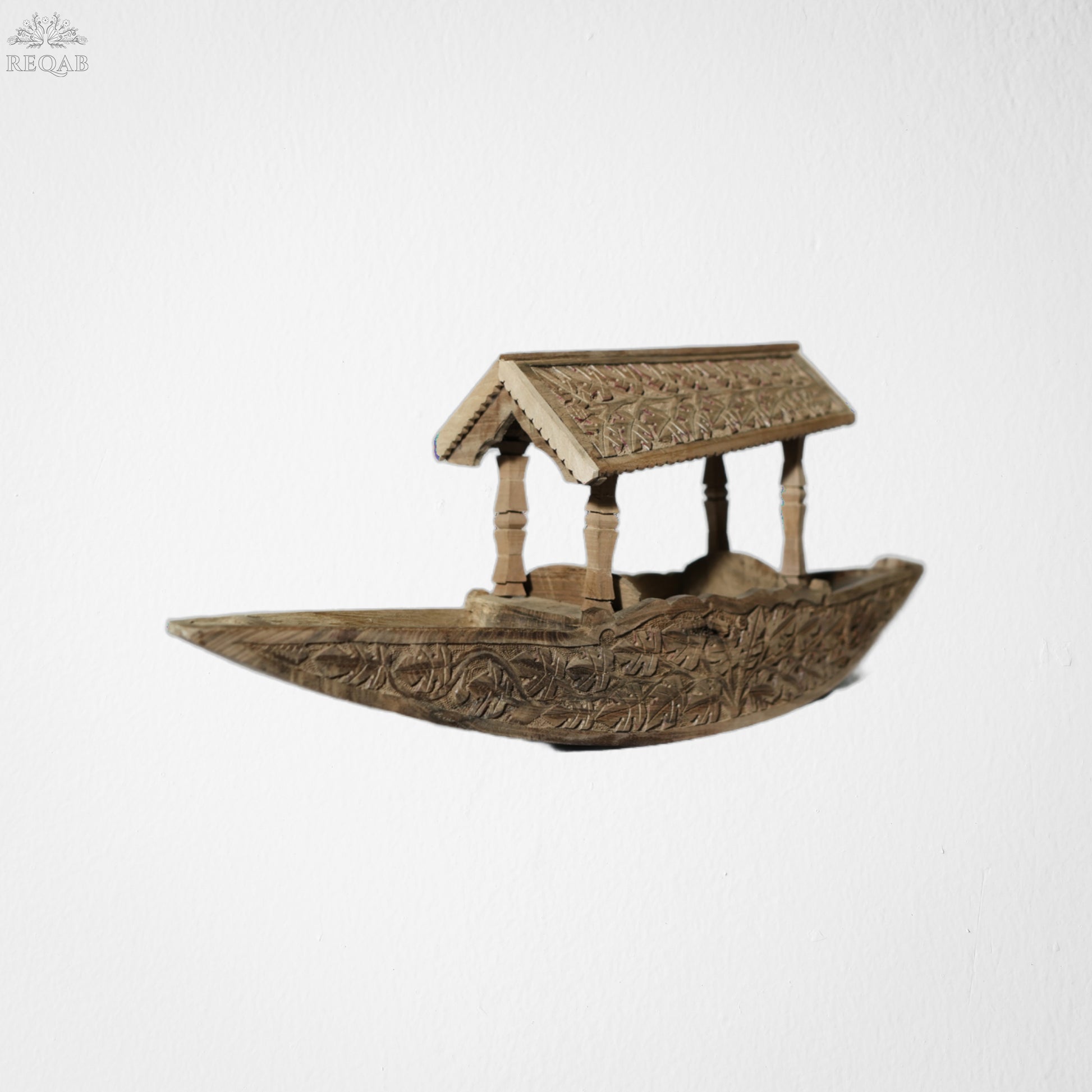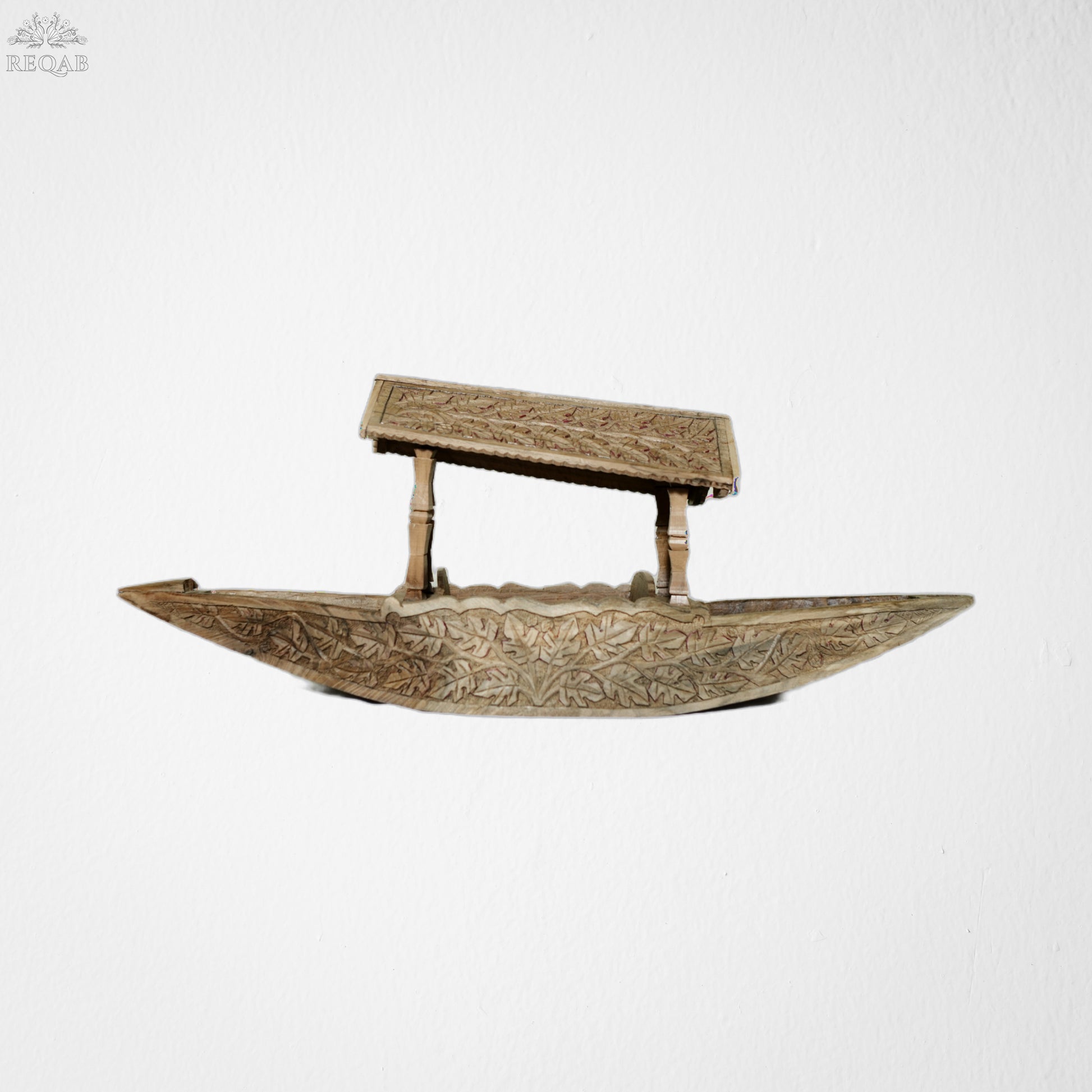 A detailed carved Shikara; which is an iconic symbol of Kashmir's serene water bodies, renowned for their beauty and tranquillity.