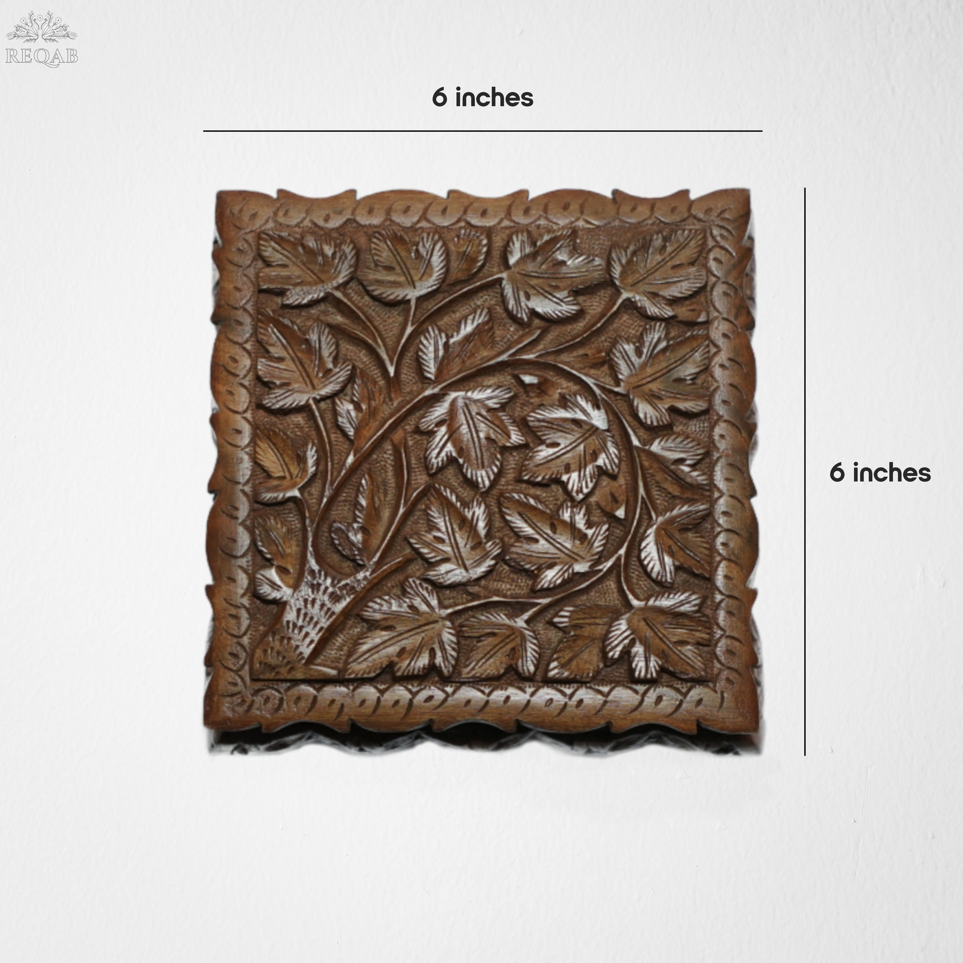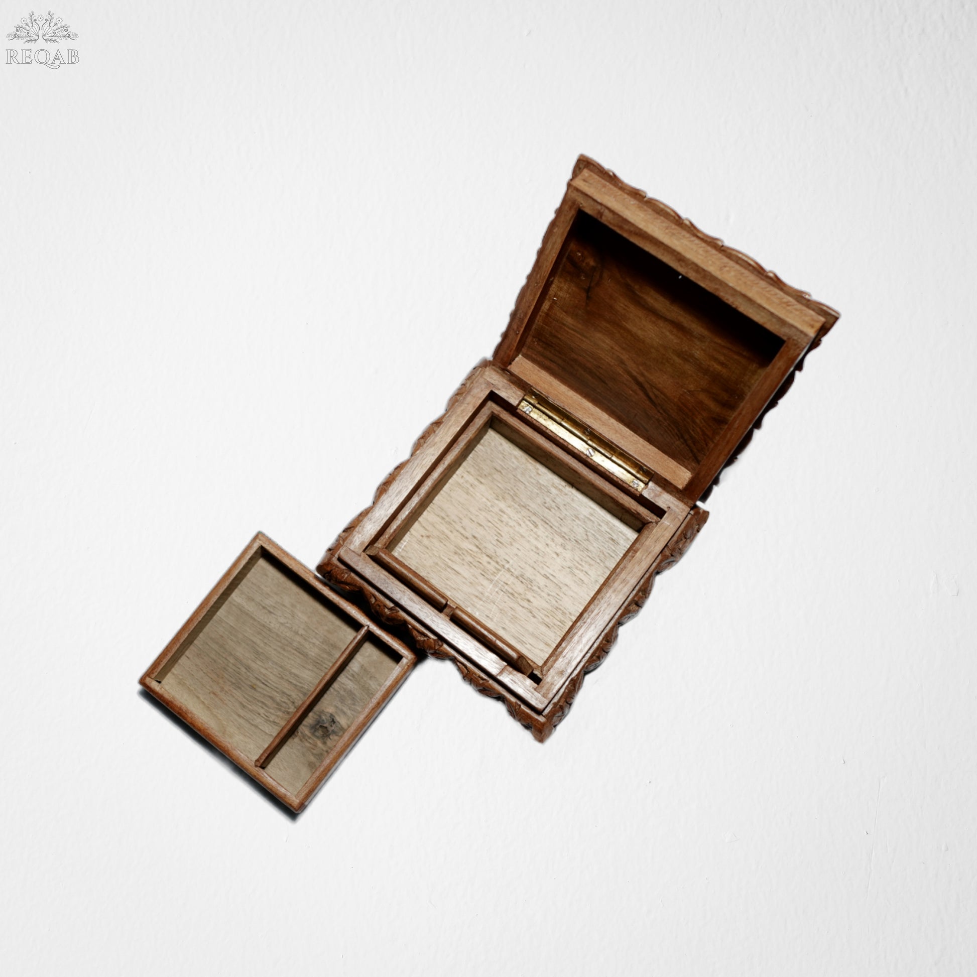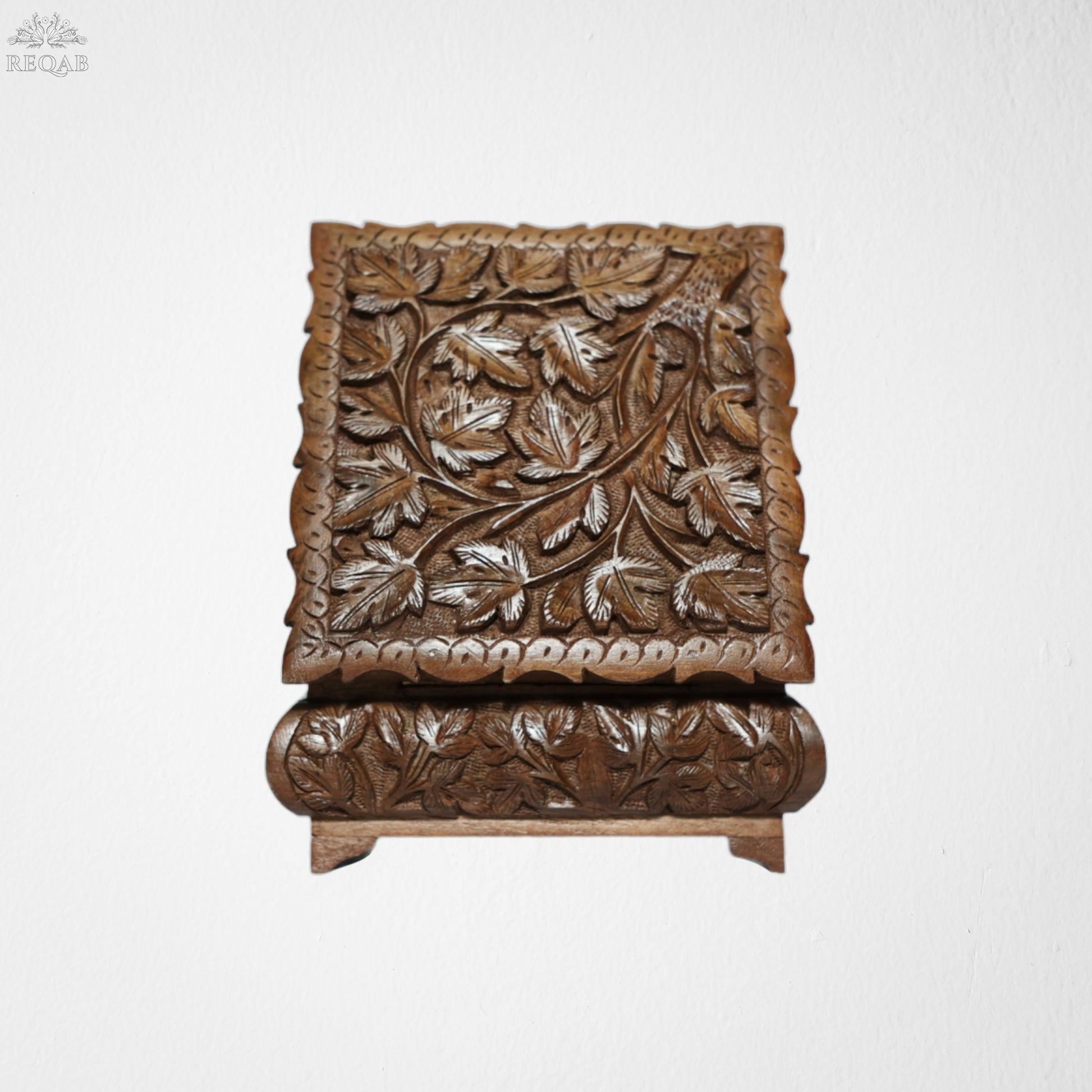 This exquisite walnut wood box of ours is designed to safeguard your most precious possessions. Crafted with care, this square-shaped box features intricate chinar leaf engravings, adorning not just the top but also its sides, adding a touch of Kashmiri artistry to your collection.