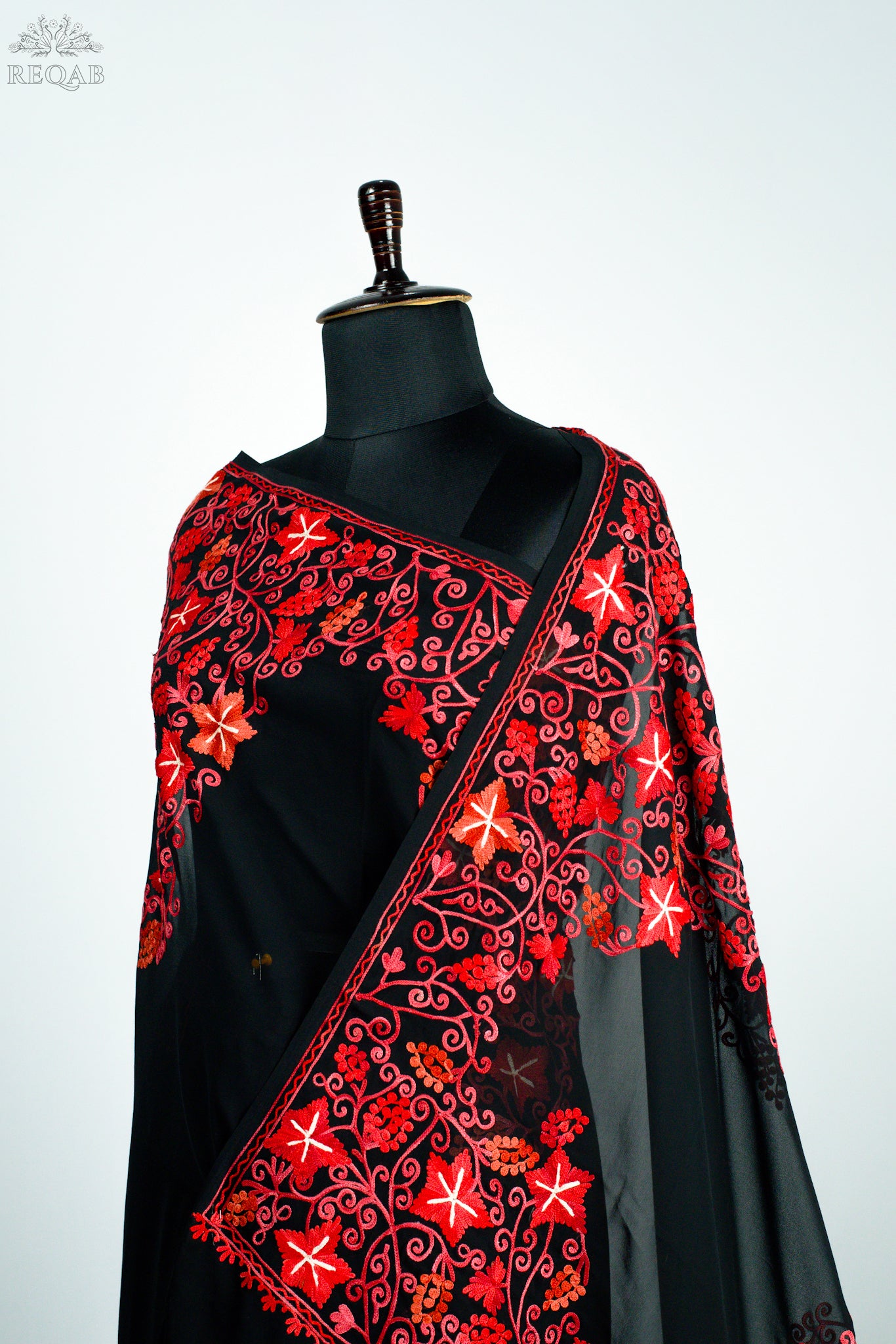 The Woodsmoke Saree is a breathtaking creation, exuding elegance and charm. Crafted from semi-georgette fabric, this saree drapes beautifully, accentuating the wearer's grace. The highlight of this saree is its intricate heavy Aari embroidery work, showcasing an array of stunning floral motifs in rich shades of red.